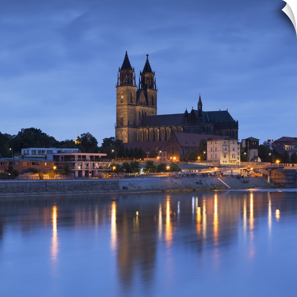 <p>St Mauritius and St Katharina Cathedral and River Elbe at dusk, Magdeburg, Saxony-Anhalt, Germany.</p>