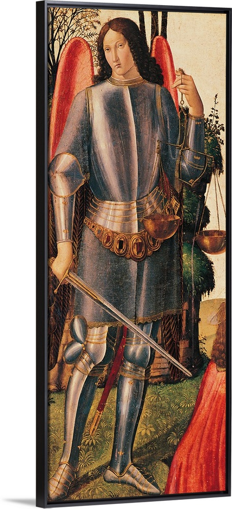 <p>St Michael the Archangel, by Cosimo Rosselli, 15th Century, - Italy, Tuscany, Florence, Stibbert Museum. All. St Michael the Archangel sword armor cuirass belt jewellery scales balance souls grass decoration trees plants red gold green gray brown tones sh</p>