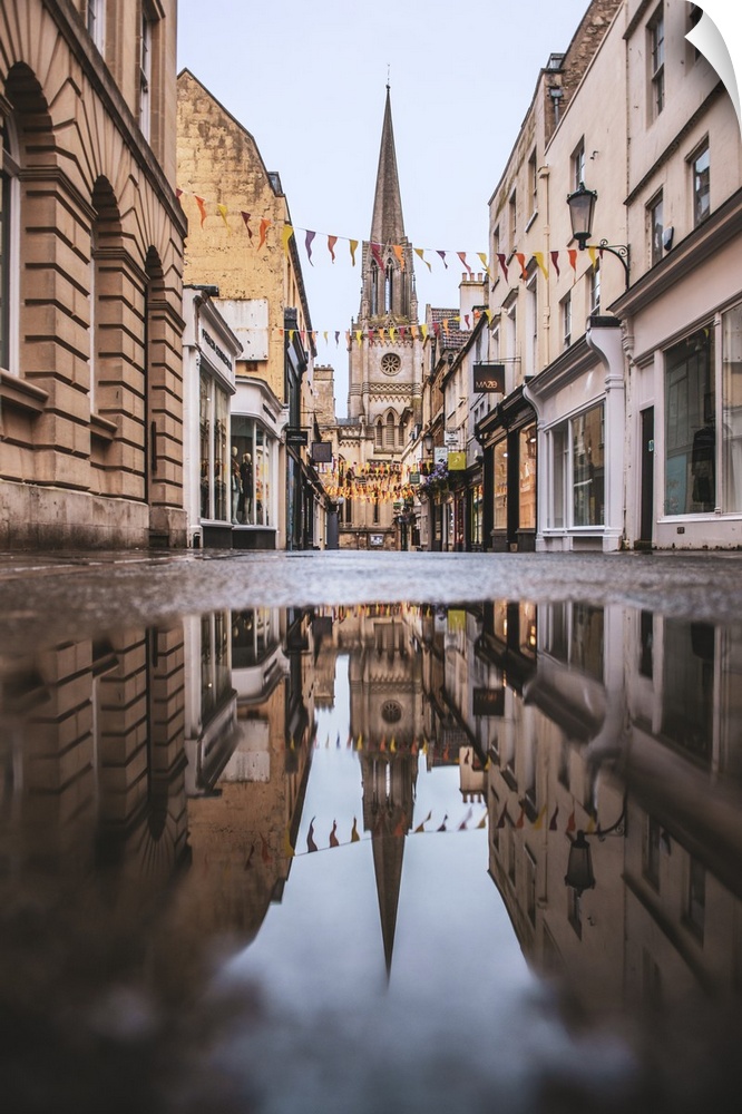 <p>Photograph of St. Michael's Church reflecting into a puddle in the middle of a street in Bath, England.</p>
