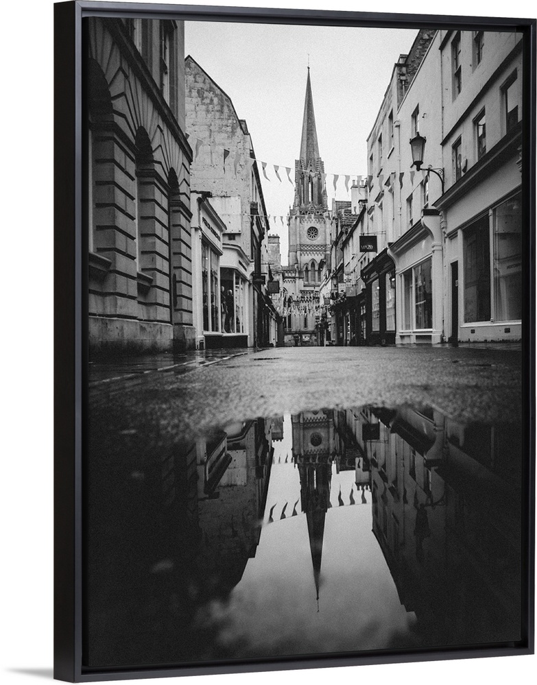 <p>Black and white photograph of St. Michael's Church reflecting into a puddle in the middle of a street in Bath, England.</p>