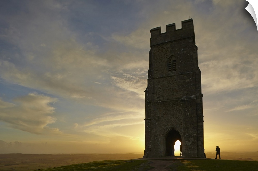 <p>St. Michael's Tower silhouetted at sunset, on the summit of Glastonbury Tor, Glastonbury, Somerset, England, United Kingdom, Europe</p>
