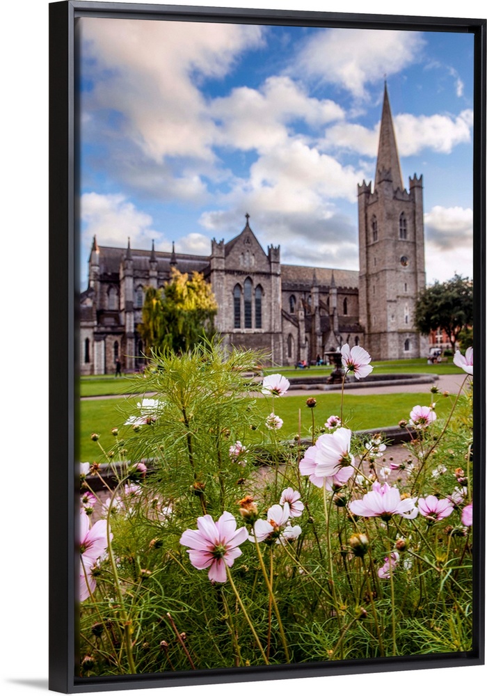 <p>Photograph of St Patrick's Cathedral in Dublin, Ireland, with a field of pink and white wildflowers in the foreground.</p>