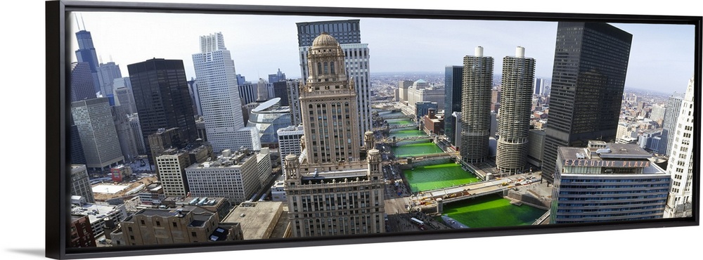 <p>The water of the Chicago River has been dyed green in celebration of Saint Patrick's day. It appears strange as it flows through the crowded skyscrapers.</p>