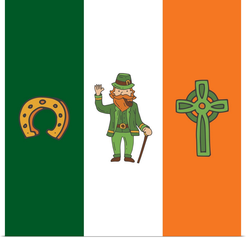 <p>The Irish flag with a horseshoe, leprechaun, and Celtic cross.</p>