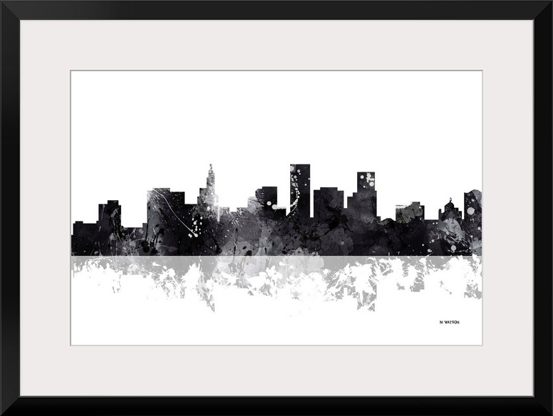 <p>Contemporary black and white watercolor skyline casting a mirror-like reflection below.</p>