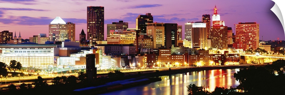 <p>Panoramic photograph of city skyline on a cloudy night. The building lights are glowing and they are reflected in the water below.</p>
