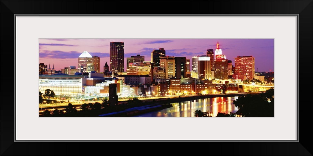 <p>Panoramic photograph of city skyline on a cloudy night. The building lights are glowing and they are reflected in the water below.</p>