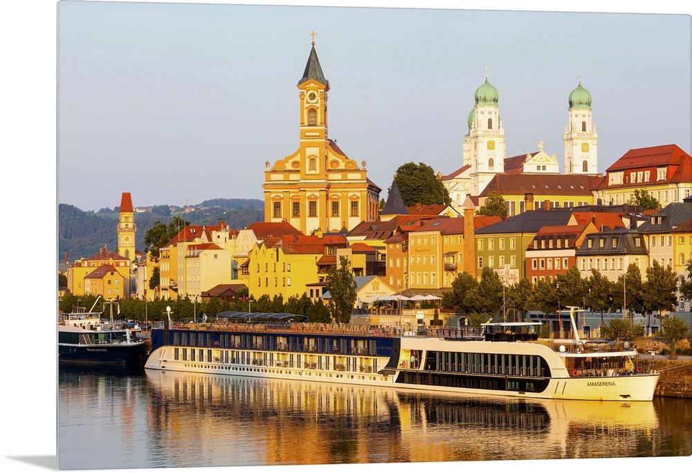 <p>St. Paul's church and St. Stephan's Cathedral illuminated at sunset, Passau, Lower Bavaria, Bavaria, Germany.</p>
