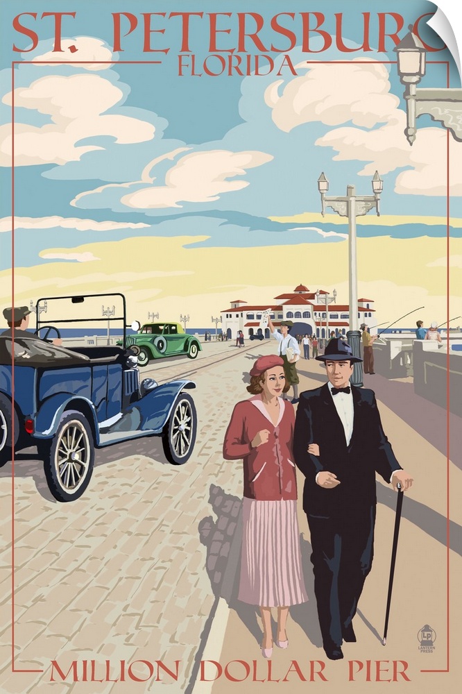 <p>Retro stylized art poster of a classy couple walking along a pier.</p>