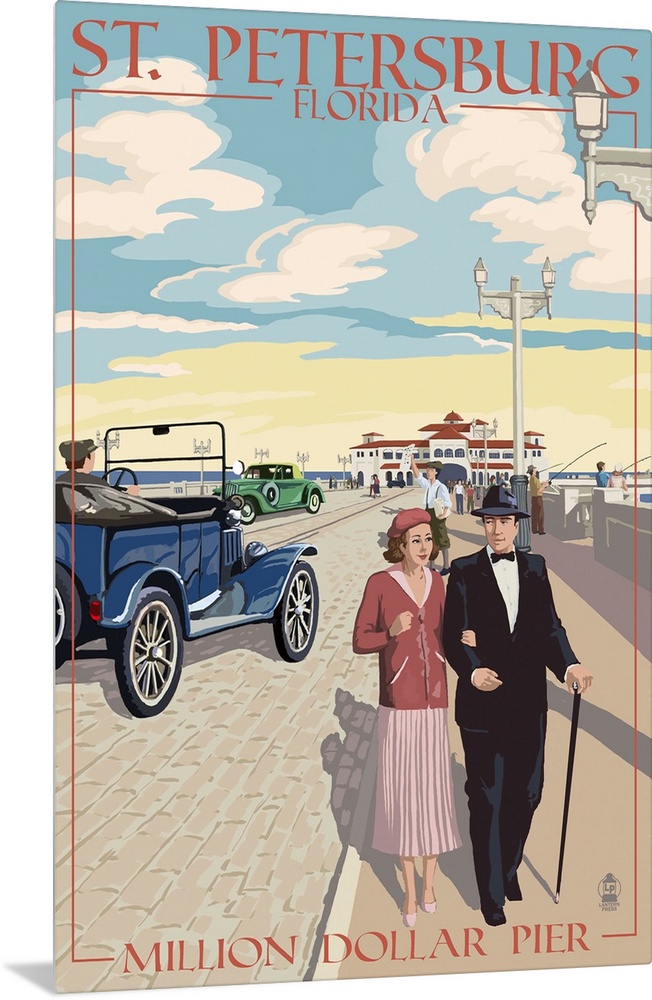 <p>Retro stylized art poster of a classy couple walking along a pier.</p>
