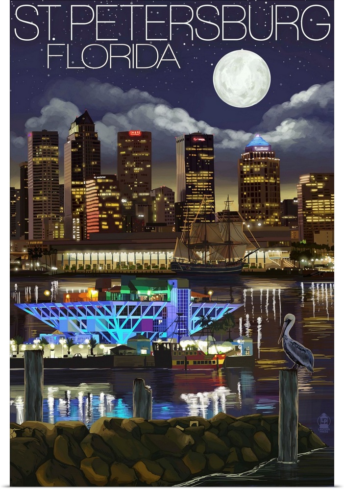 <p>Retro stylized art poster of a city skyline at night.</p>