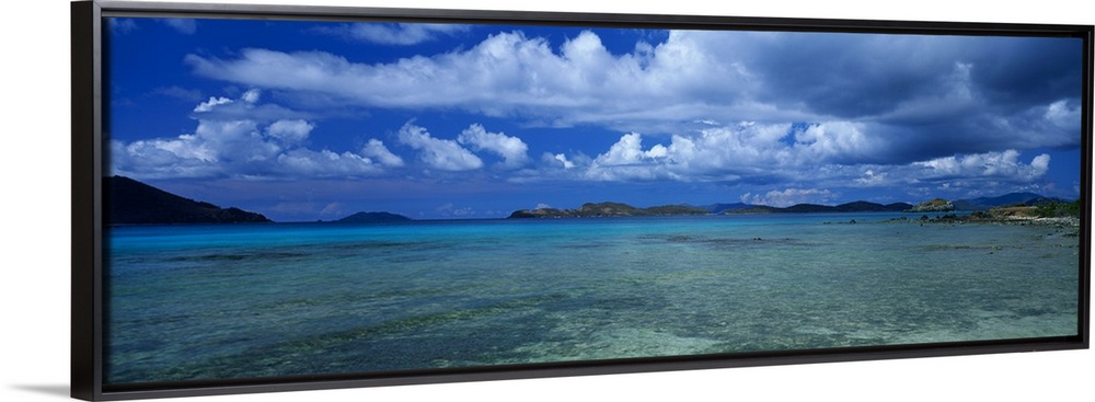 <p>A breathtaking photograph of teal ocean water with large clouds in the sky that hang over.</p>