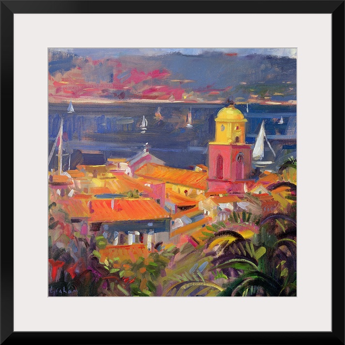 <p>Colorful oil painting of Mediterranean French Riviera with bright rooftops and waterfront that is filled with sailboats with mountains in the distance.</p>