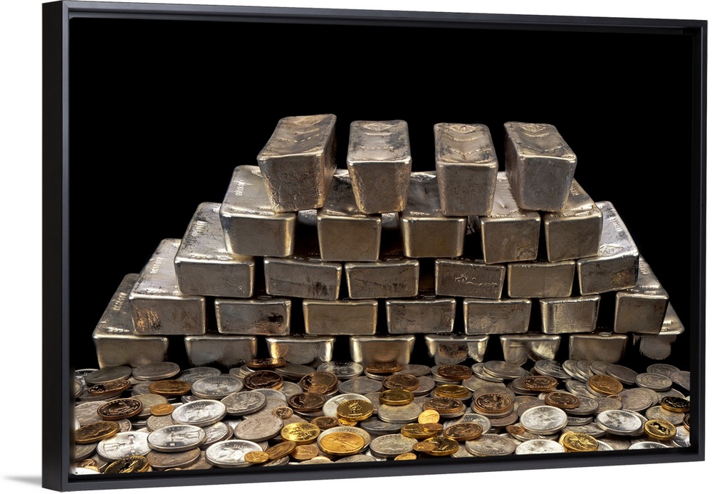 <p>Stack of sliver bars and pile of coins</p>