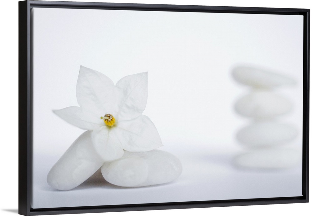<p>Two soft white stones are laid onto each other with a delicate white flower on top of them. A pile of four stones is shown in the background out of focus.</p>