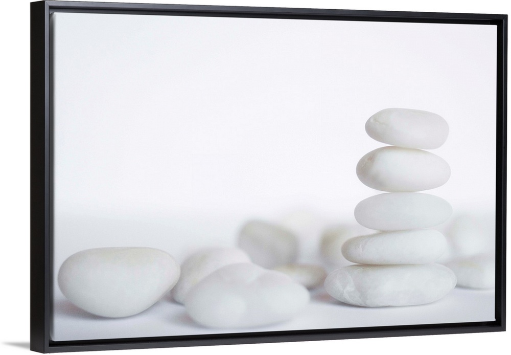 <p>Horizontal photo of smooth rocks sitting on a neutral surface with some stacked up and some by themselves.</p>