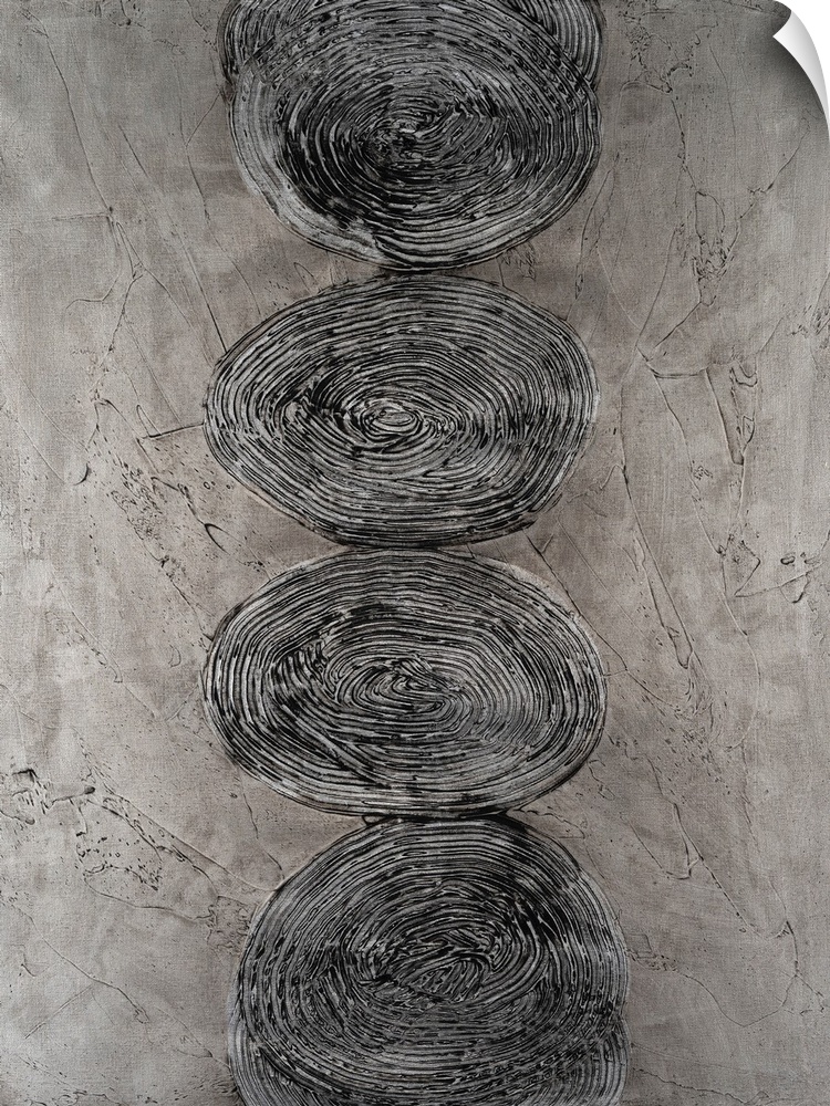 <p>An earthy, organic painting of bleack swirls on a neutral taupe background. This contemporary painting features layers of texture</p>