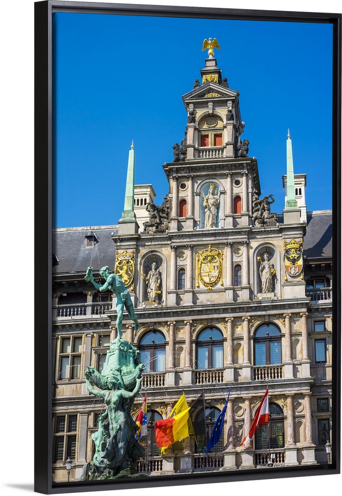 <p>Belgium, Flanders, Antwerp (Antwerpen). Stadhuis city hall and statue of Silvius Brabo on Grote Markt square.</p>