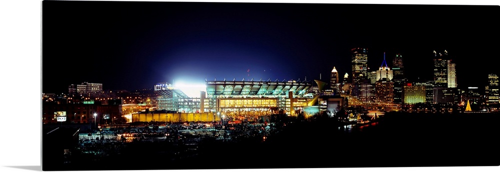 <p>Panoramic photograph of Heinz Field lit up at night as the Steelers play a football game. The skyscrapers in the background of this Pennsylvania skyline can be seen surrounding the stadium.</p>