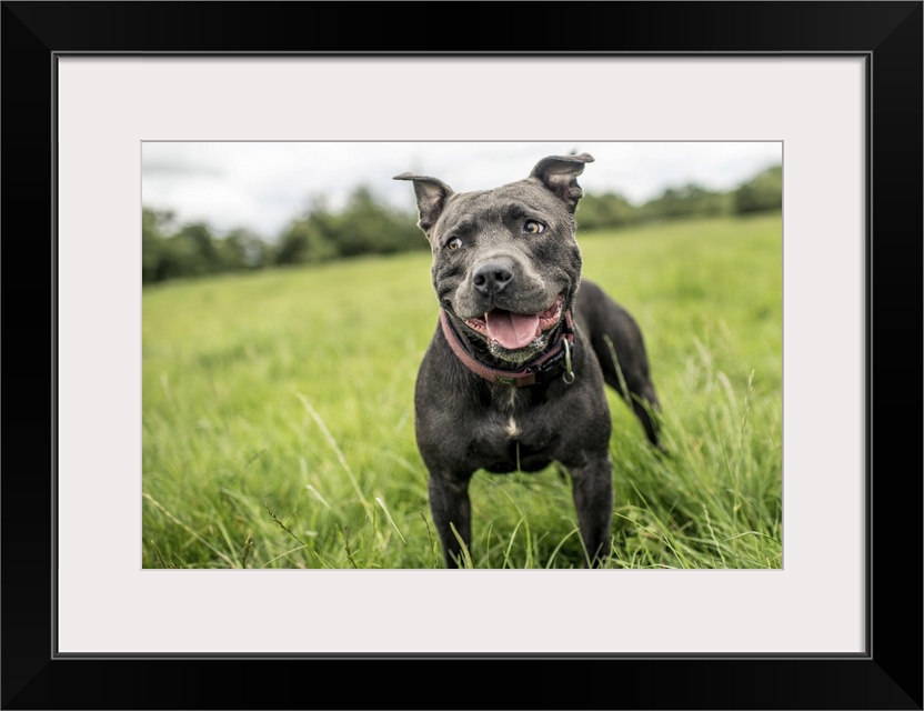 <p>Staffordshire Bull Terrier standing in a green field, United Kingdom, Europe</p>