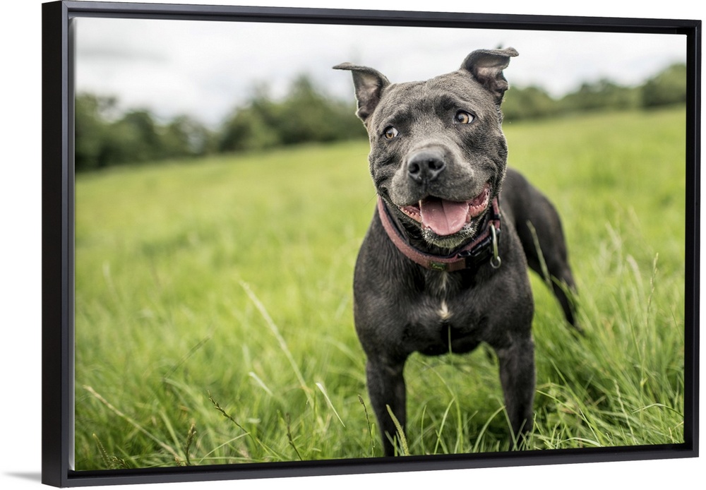 <p>Staffordshire Bull Terrier standing in a green field, United Kingdom, Europe</p>