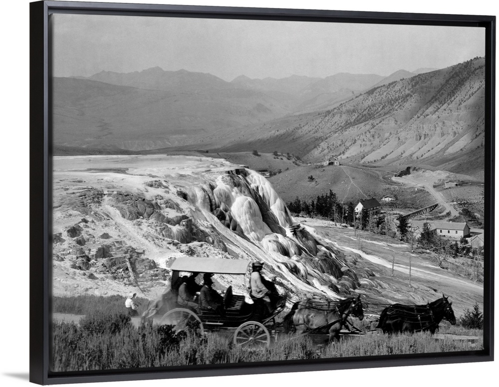 <p>A stagecoach takes tourists past Jupiter Terrace in Mammoth Hot Springs, Yellowstone National Park. The buildings of Fort Yellowstone can be seen in the distance.</p>