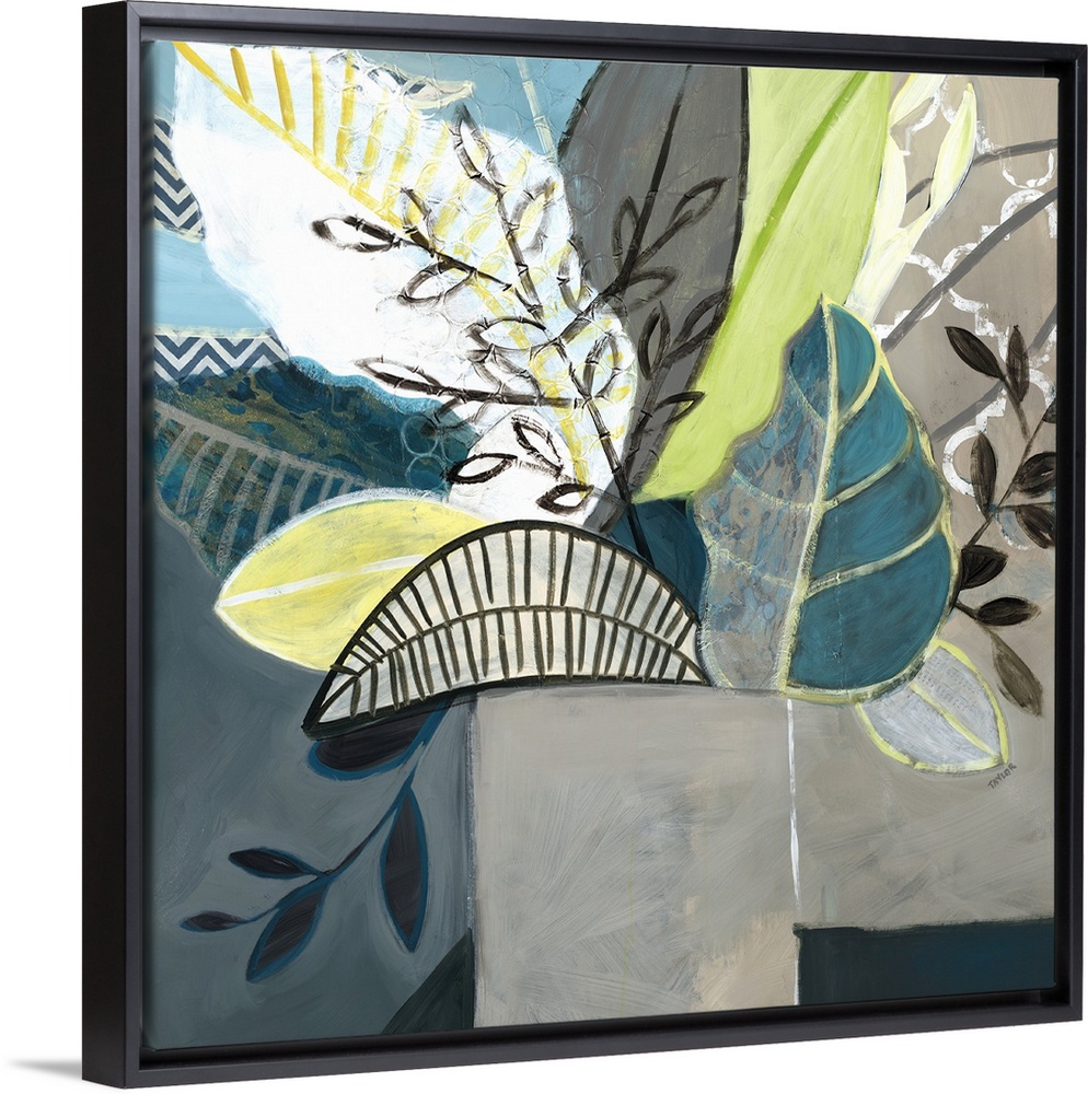 <p>Contemporary abstract painting of a vase full of various leaves and greenery, on a decorative background of neutral and cool tones.</p>