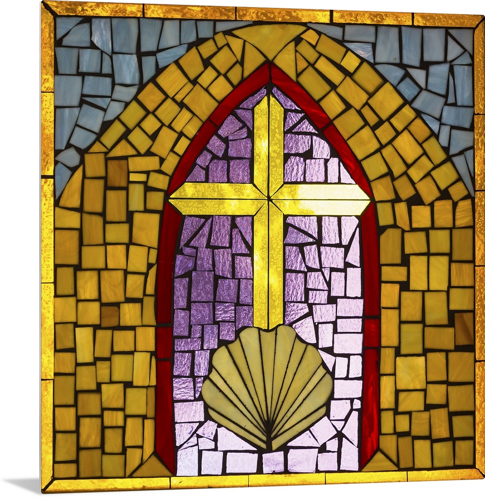 <p>Artwork done in a stained-glass style depicting a cross and shell, symbols of Christianity.</p>