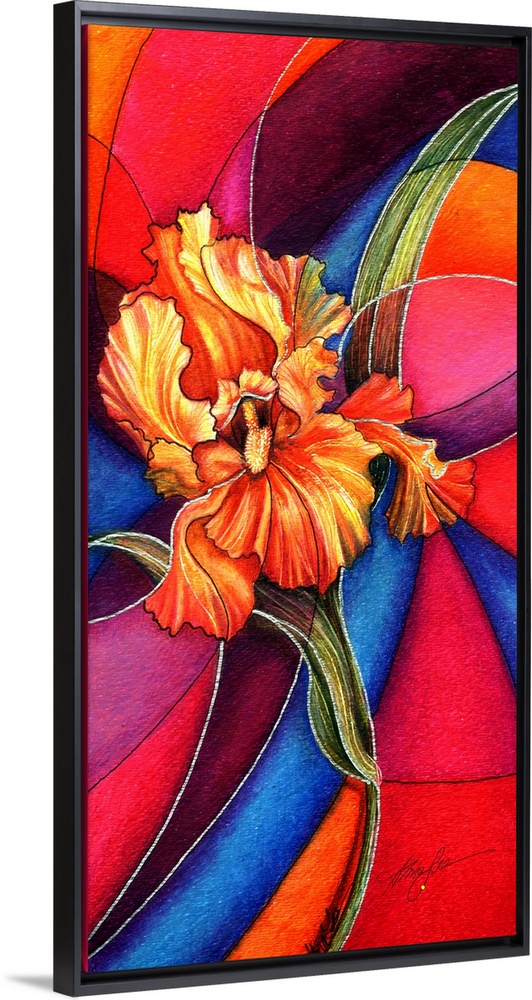 <p>A painting of an orange iris against a vibrant colored background in the style of stain glass.</p>