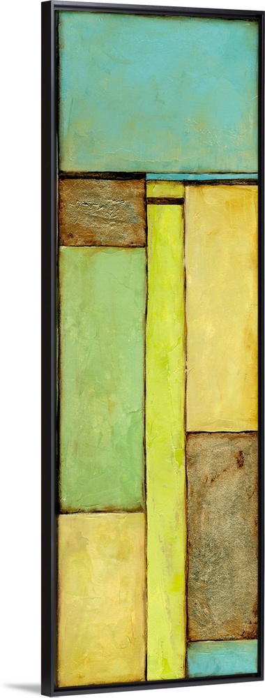 <p>Contemporary abstract painting using geometric shapes in pale green and blue.</p>