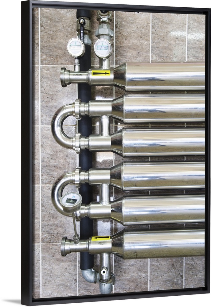 <p>Stainless steel cooling coils to cool the must Detail of end points. Kantina Miqesia or Medaur winery, Koplik. Albania, Balkan, Europe.</p>
