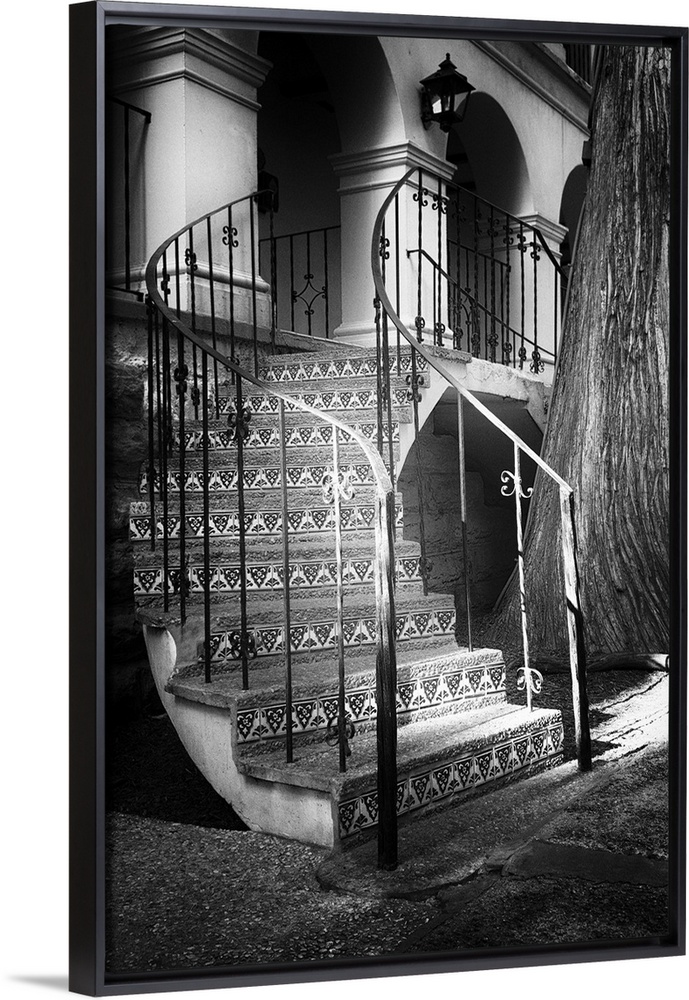 <p>Wrought Iron Staircase of a Traditional Building in Black and White with a Light Stream, Riverwalk, San Antonio, Texas</p>