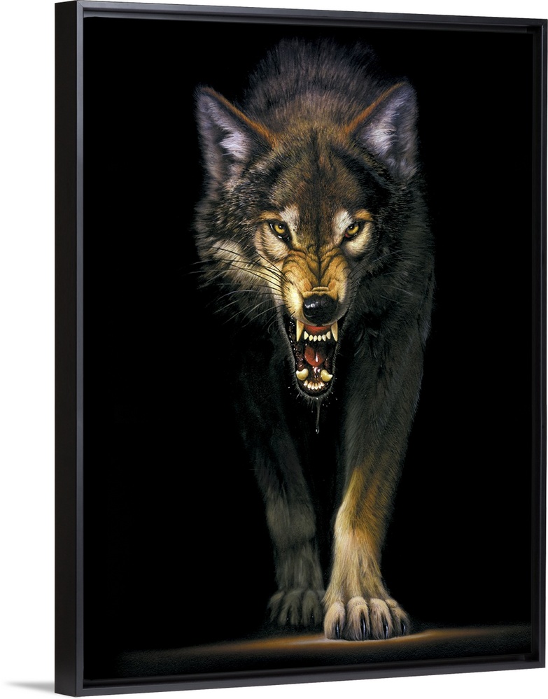 <p>Portrait, large wall picture of a fierce wolf approaching out of the darkness, his lips curled back to reveal large, gnashing teeth as he looks forward with golden eyes.</p>