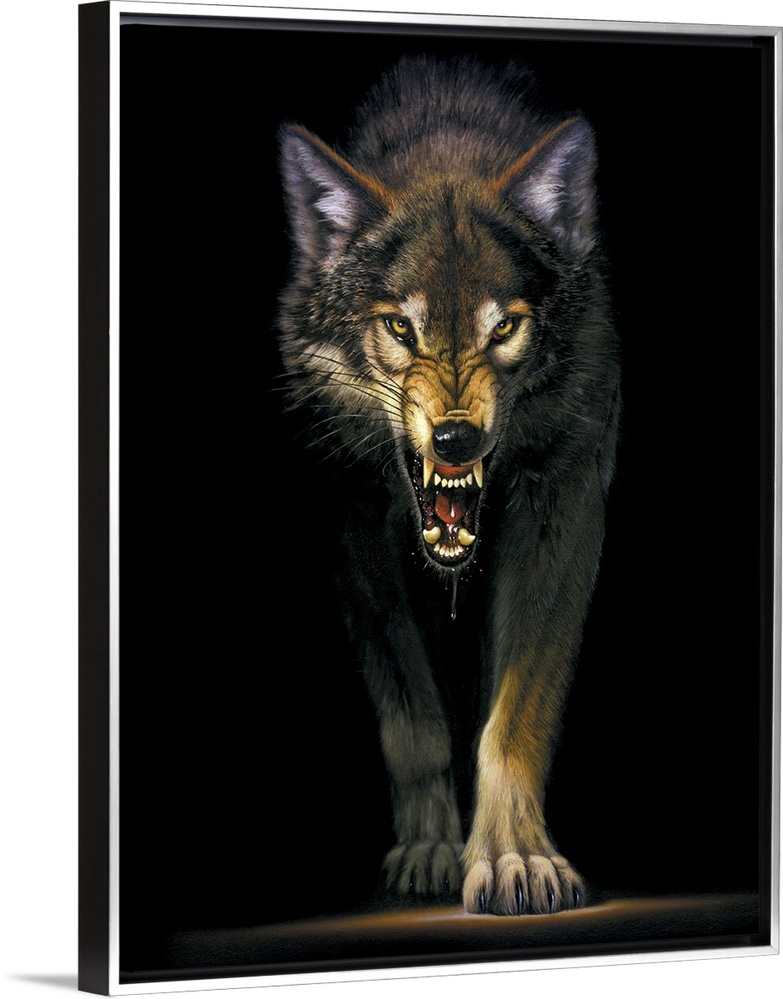 <p>Portrait, large wall picture of a fierce wolf approaching out of the darkness, his lips curled back to reveal large, gnashing teeth as he looks forward with golden eyes.</p>
