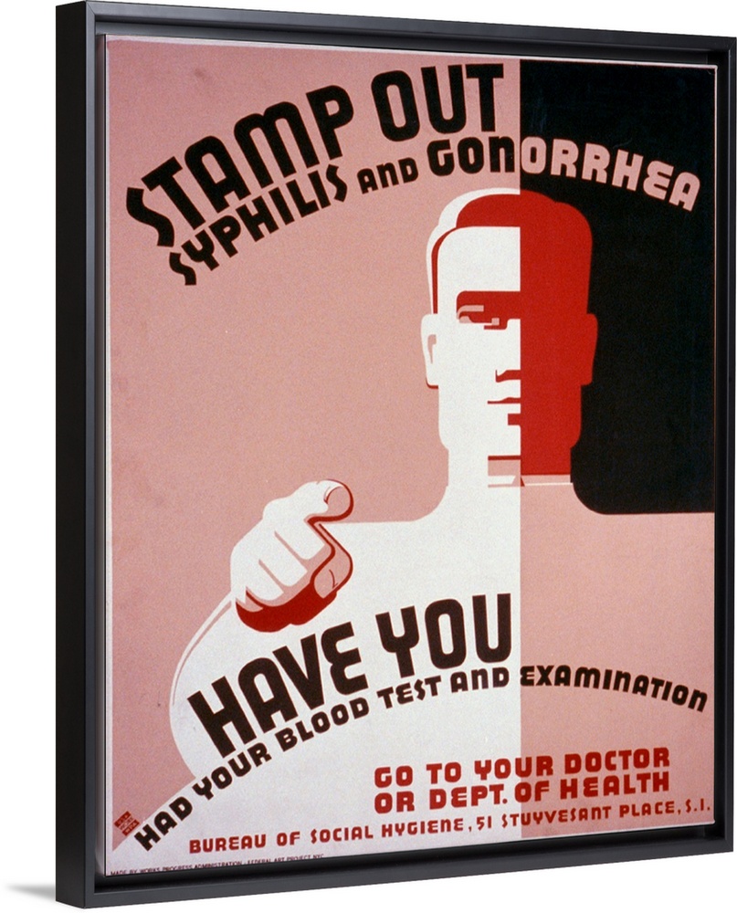 <p>Artwork encouraging blood testing and examinations to identify persons with syphilis and gonorrhea, showing a man pointing at the viewer.</p>