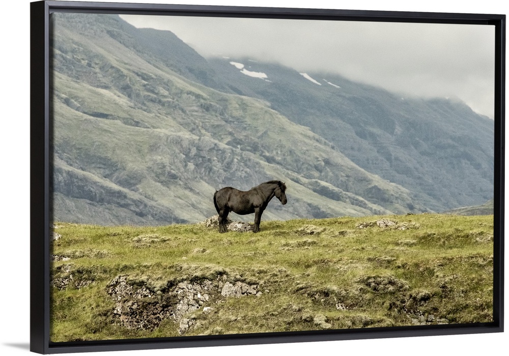 <p>Photograph of a lone horse in the field with fog rolling over mountains in the background.</p>