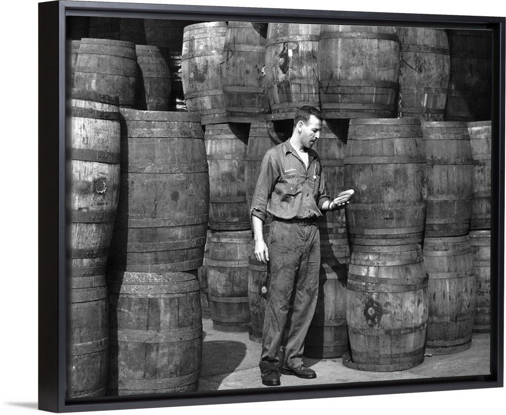<p>Stanley Hyams amidst barrels at the Washington Pickle Works in Brooklyn, New York. Photograph, Roger Higgins, 1959.</p>
