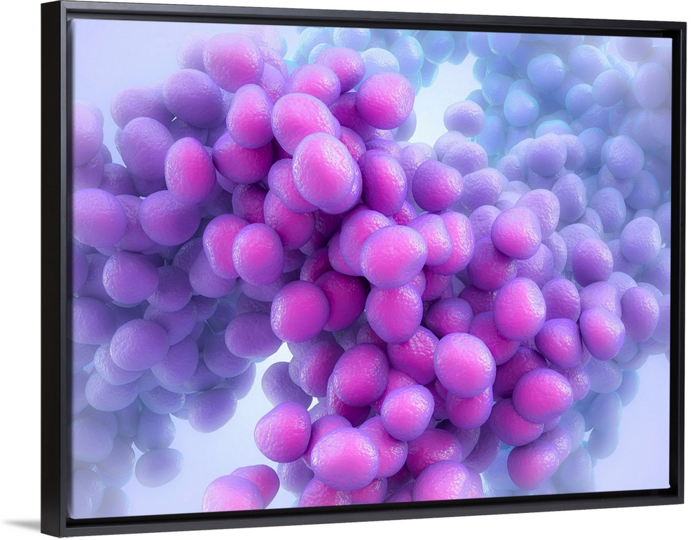 <p>Staphylococcus bacteria. Computer illustration of a group of Staphylococcus aureus bacteria. S. aureus is a Gram-positive coccus (round) bacteria that is found on the skin and mucous membranes of humans and many animals. They are usually harmless, but infections can occur on broken skin or within a blocked sweat or sebaceous gland, resulting in boils, pustules and abscesses. S. aureus can also cause food poisoning, producing toxins that induce vomiting. Certain strains cause the potentially fatal toxic shock syndrome (TSS).</p>