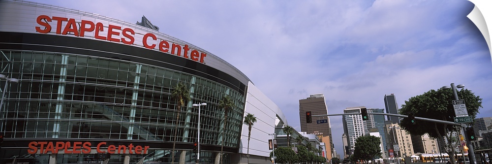 <p>Low angle view of a multi-purpose sports arena, Staples Center, City Of Los Angeles, Los Angeles County, California, USA</p>