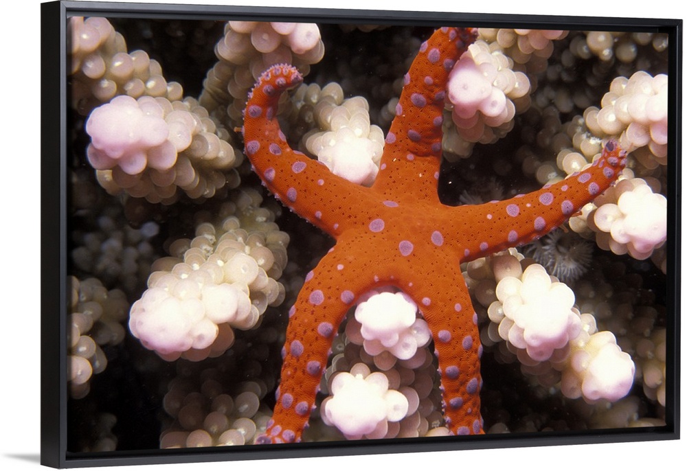 <p>Underwater photo of a starfish with purple spots on it's otherwise orange body sitting on coral polyps.</p>