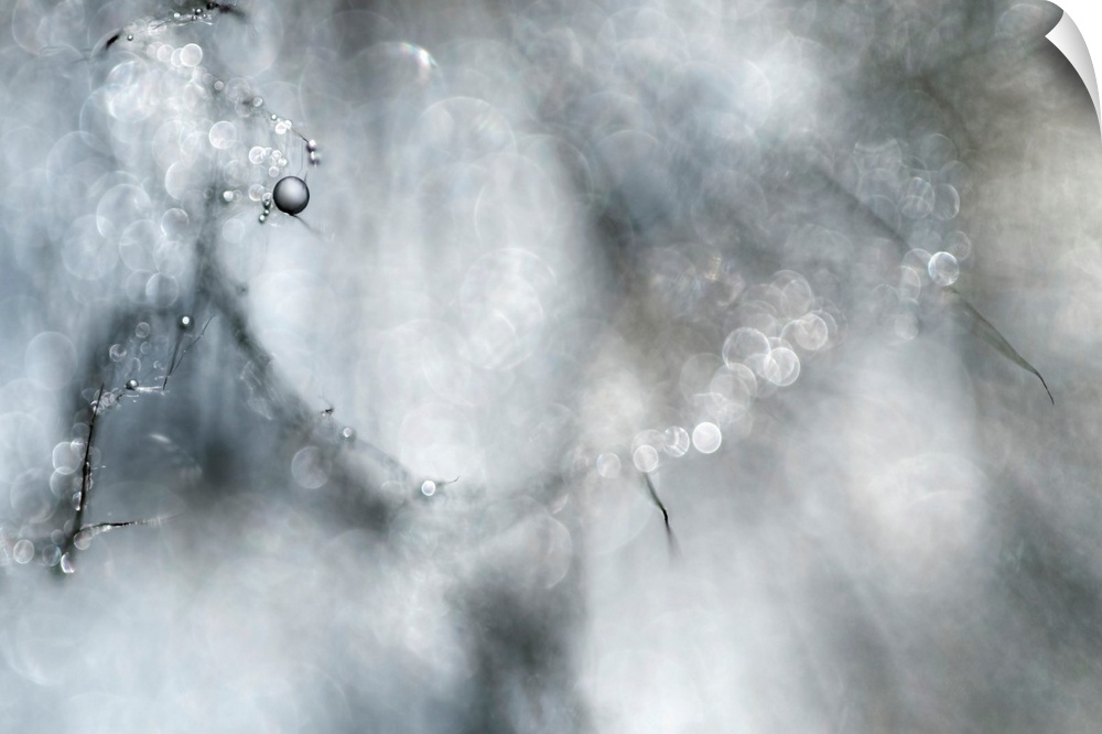 <p>Abstract artwork of a branch that contains several water droplets while the rest of the tree is blurred and out of focus.</p>