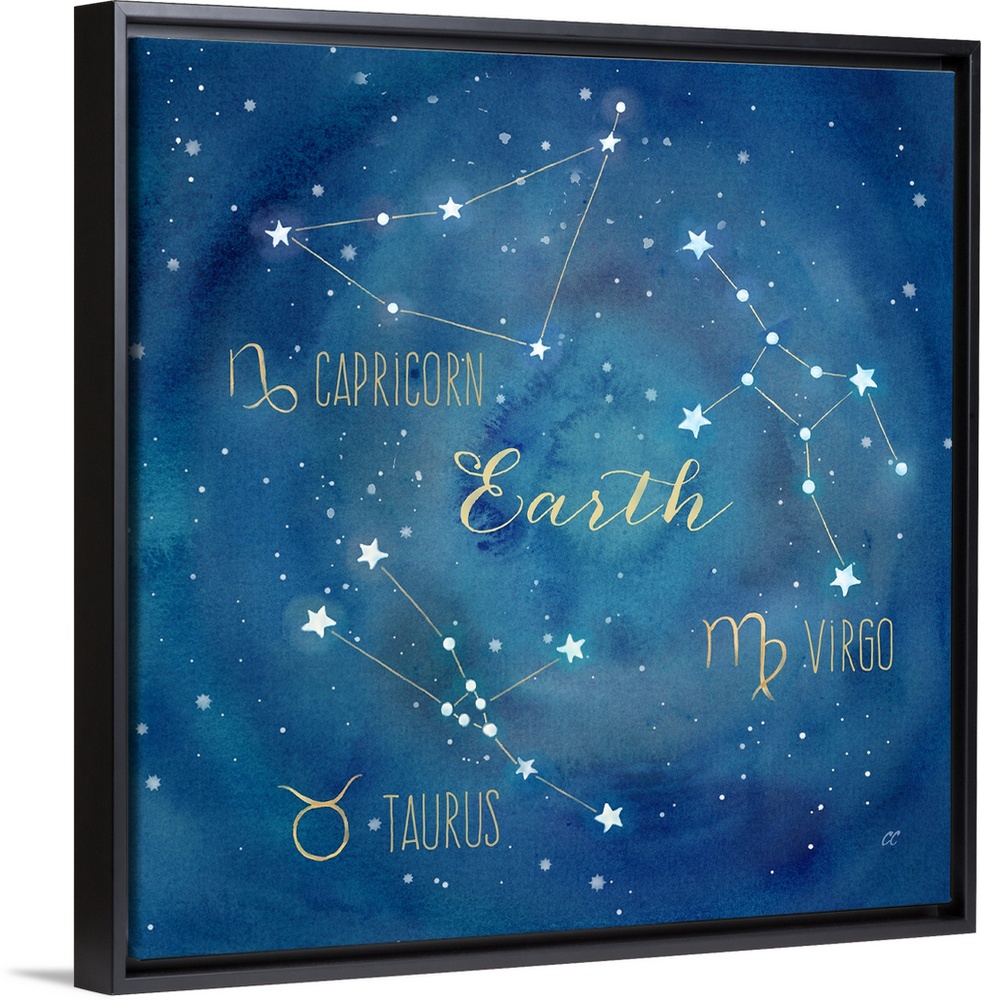 <p>Square artwork of the constellations of Capricorn, Taurus and Virgo with the symbols.</p>