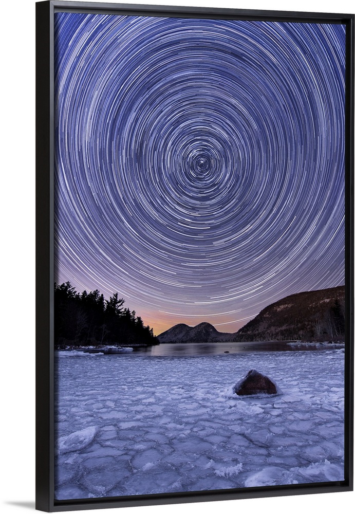 <p>Star trail over ice at Jordan Pond, Acadia National Park, Maine, USA.</p>
