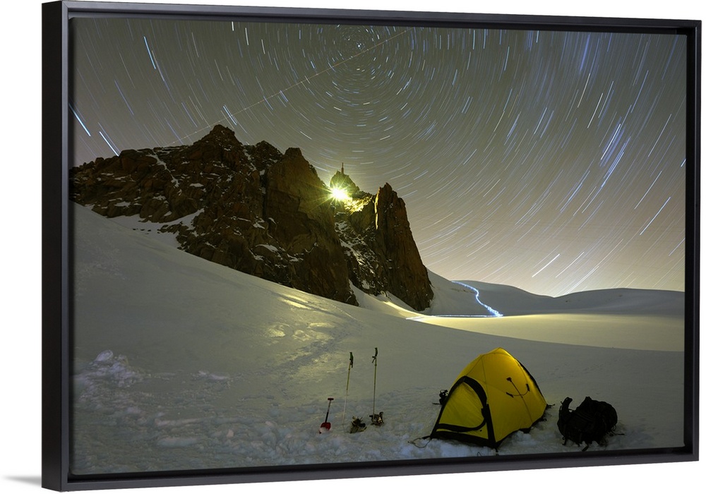 <p>Europe, France, Haute Savoie, Rhone Alps, Chamonix, star trails above Aiguille du Midi and campsite on Col du Midi.</p>