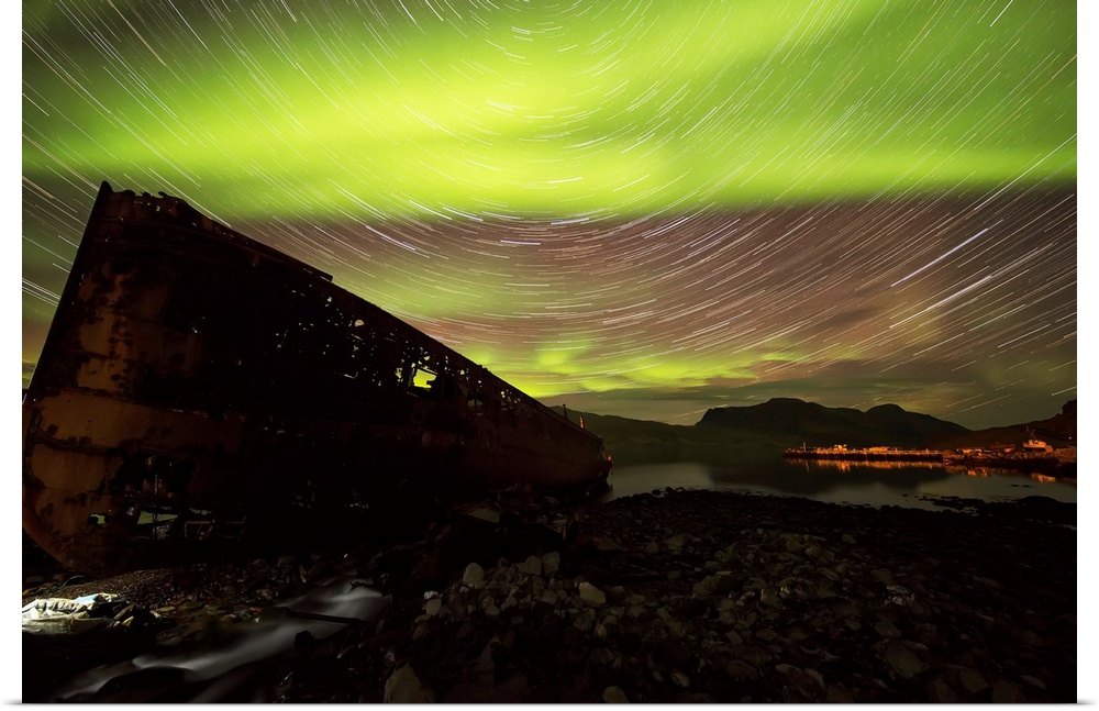 <p>Star trails and northern lights over top the town of Djupavik in the West Fjords of Iceland; Djupavik, Iceland</p>