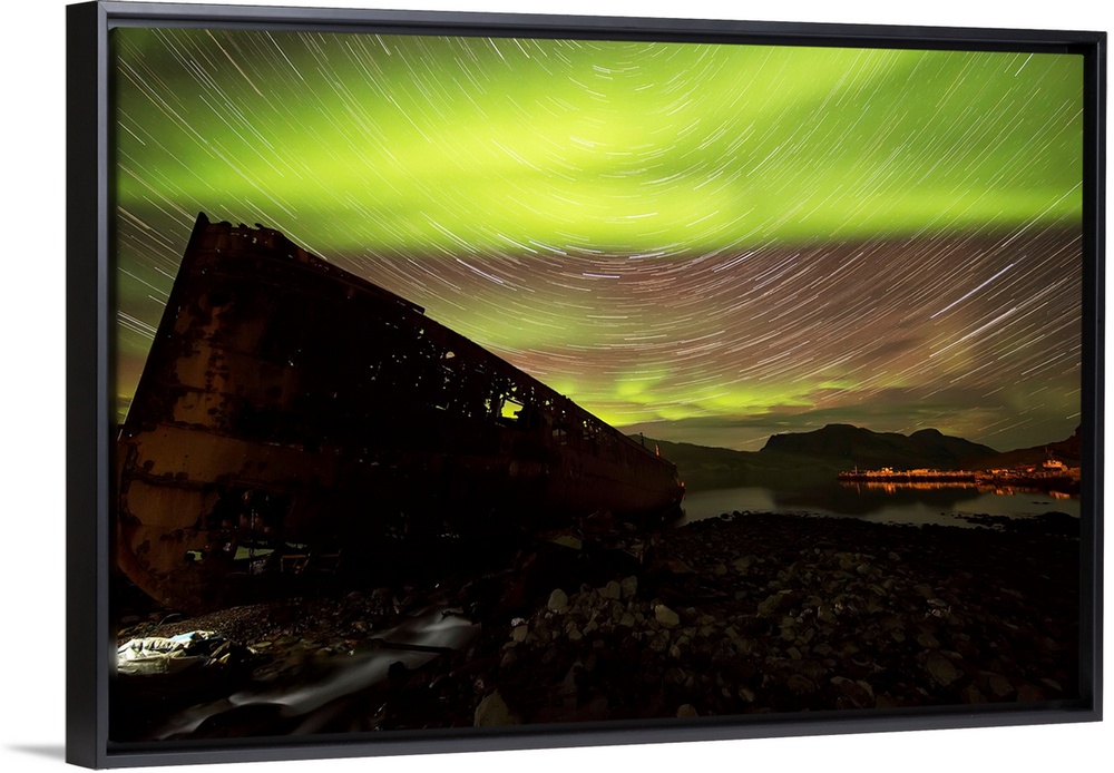 <p>Star trails and northern lights over top the town of Djupavik in the West Fjords of Iceland; Djupavik, Iceland</p>