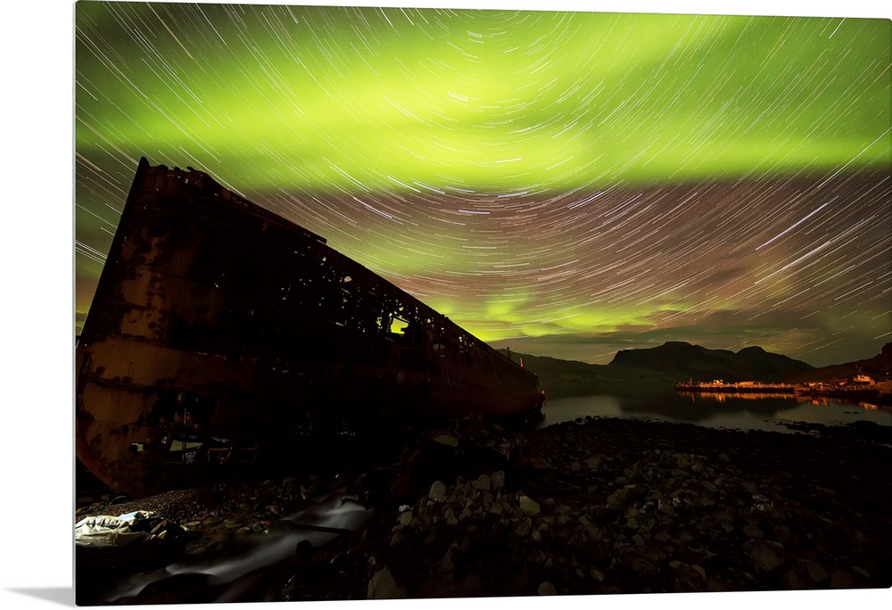 <p>Star trails and northern lights over top the town of Djupavik in the West Fjords of Iceland; Djupavik, Iceland</p>