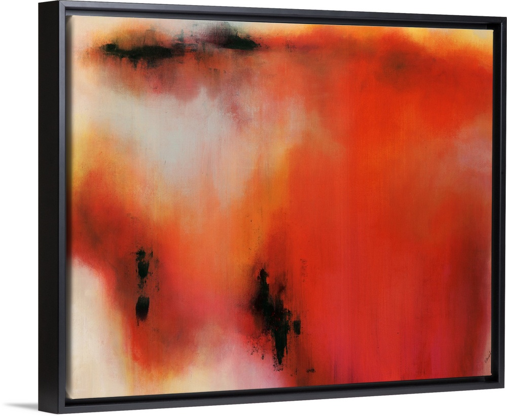 <p>Landscape, abstract painting of a large, misshapen splotchy area in fiery tones, with several small dark spots, that gradually fades into a light, neutral background.</p>
