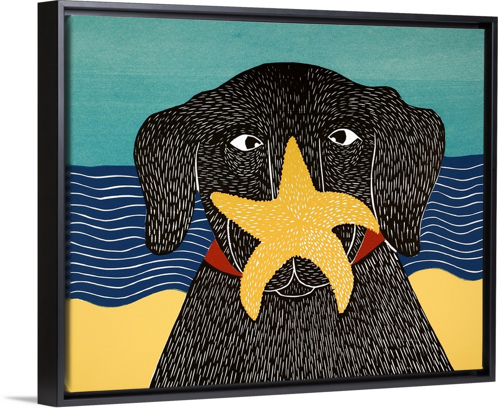 <p>Illustration of a black lab at the beach with a starfish on its nose.</p>