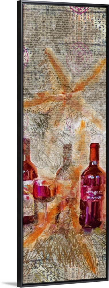 <p>Contemporary painting of red wine bottles with big, orange starfish painted over them on top of a newspaper clipping background and squiggle marks all over.</p>